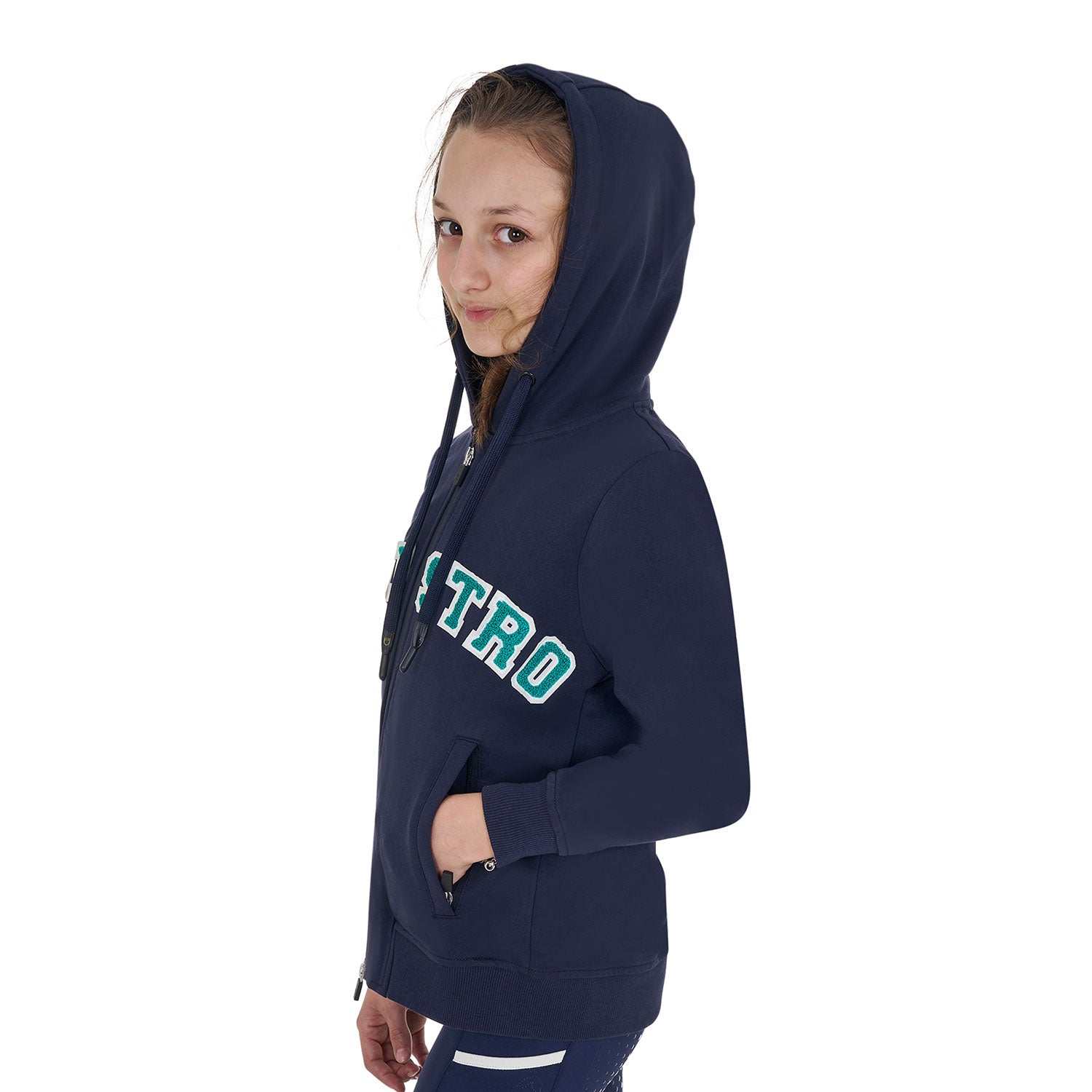 Felpa bambini con cappuccio zip e scritta effetto spugna